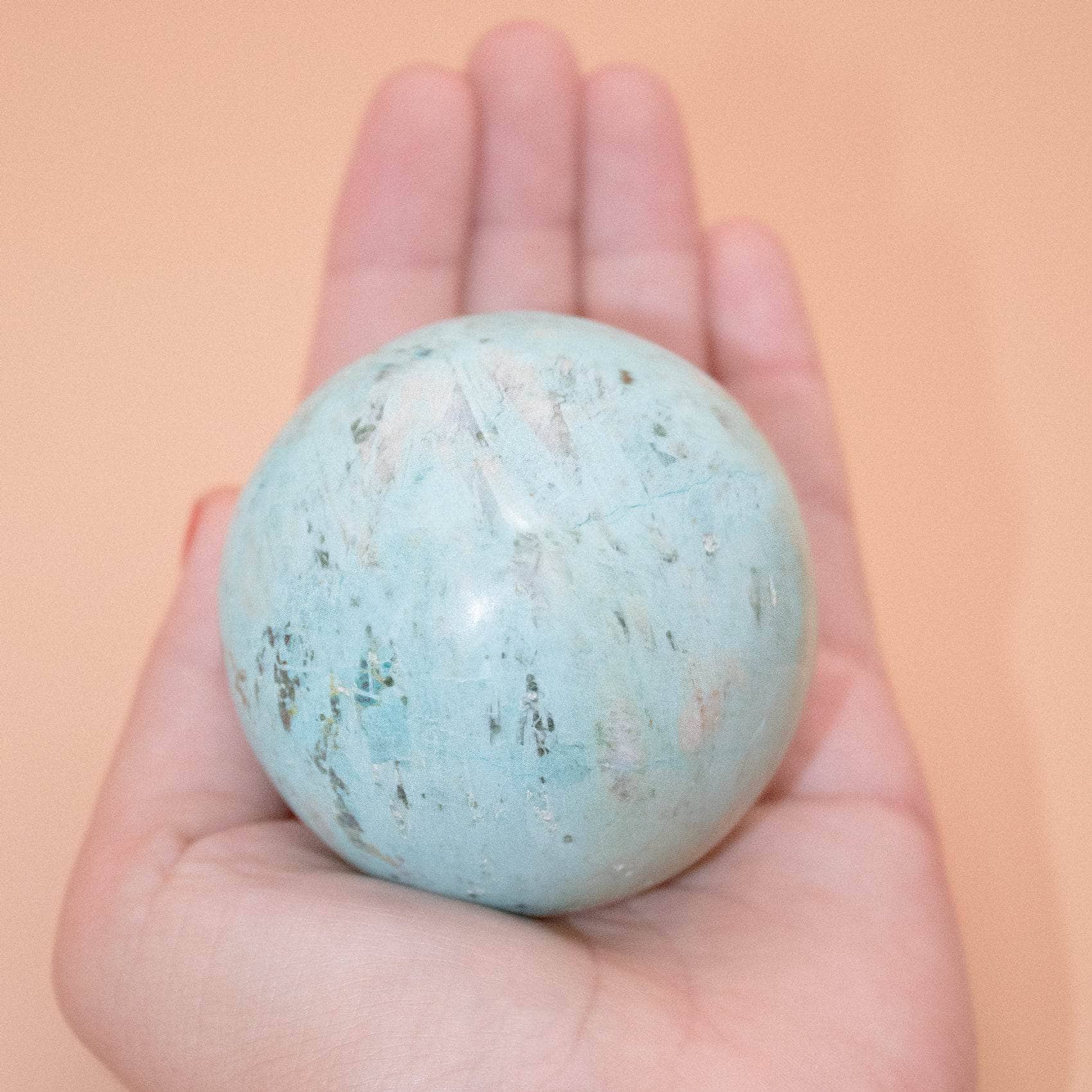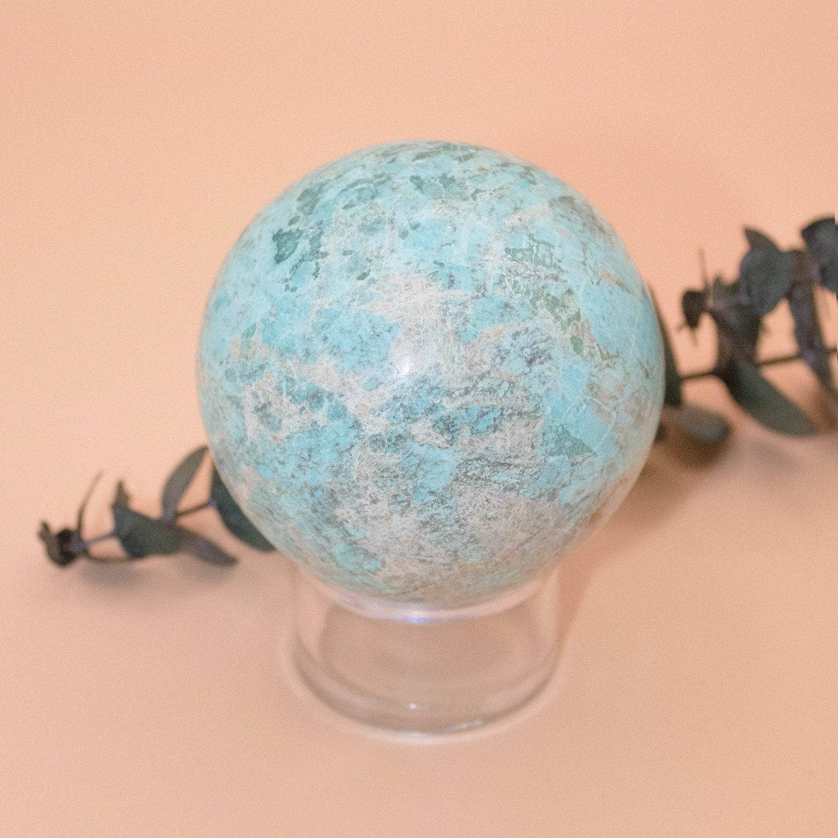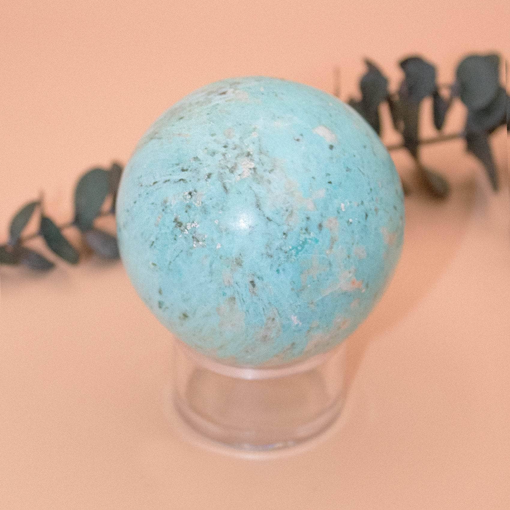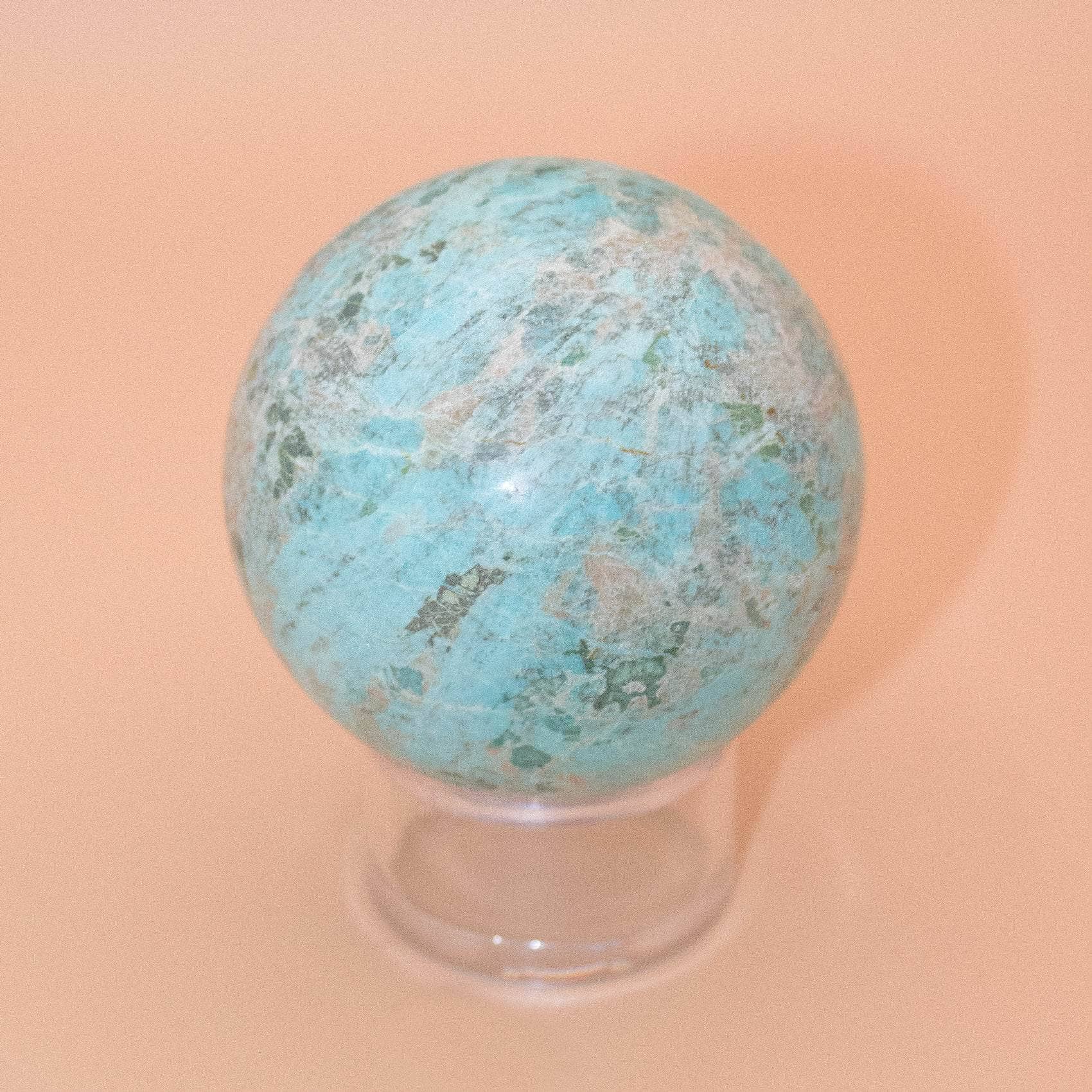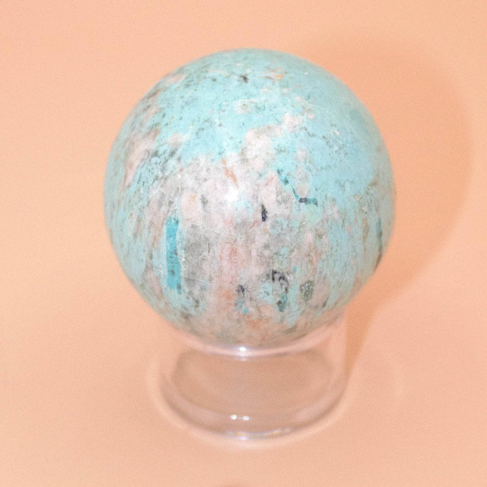 This Natural Peruvian Turquoise Sphere radiates love, peace, and a solid sense of internal power. Turquoise is a sacred stone that can raise self-awareness, promote inner harmony, and assist with clarity and communication. When you have this stone close, you instantly feel cleansed, purified, and powerful - from tip to toe.