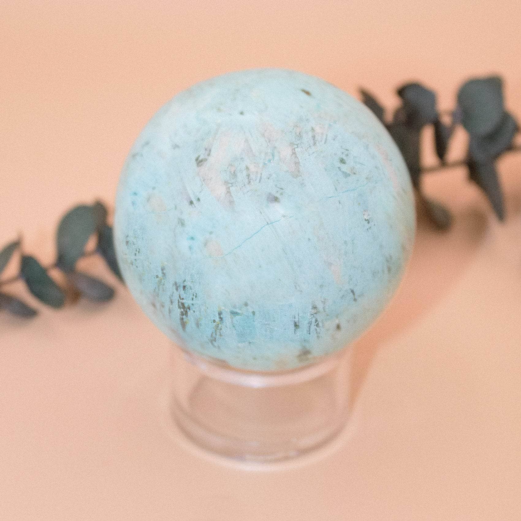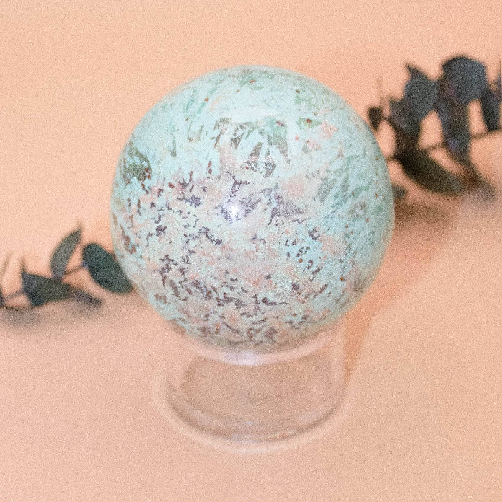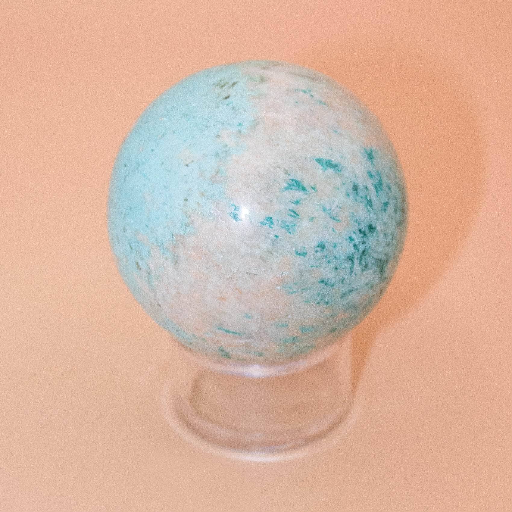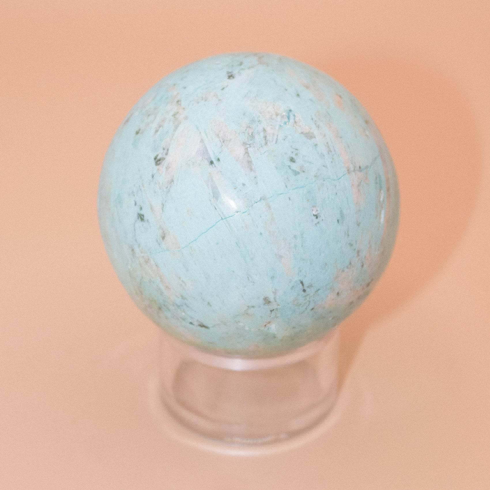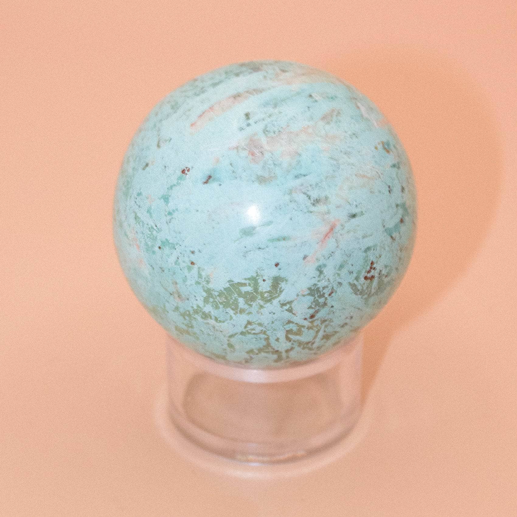 This Natural Peruvian Turquoise Sphere radiates love, peace, and a solid sense of internal power. Turquoise is a sacred stone that can raise self-awareness, promote inner harmony, and assist with clarity and communication. When you have this stone close, you instantly feel cleansed, purified, and powerful - from tip to toe.